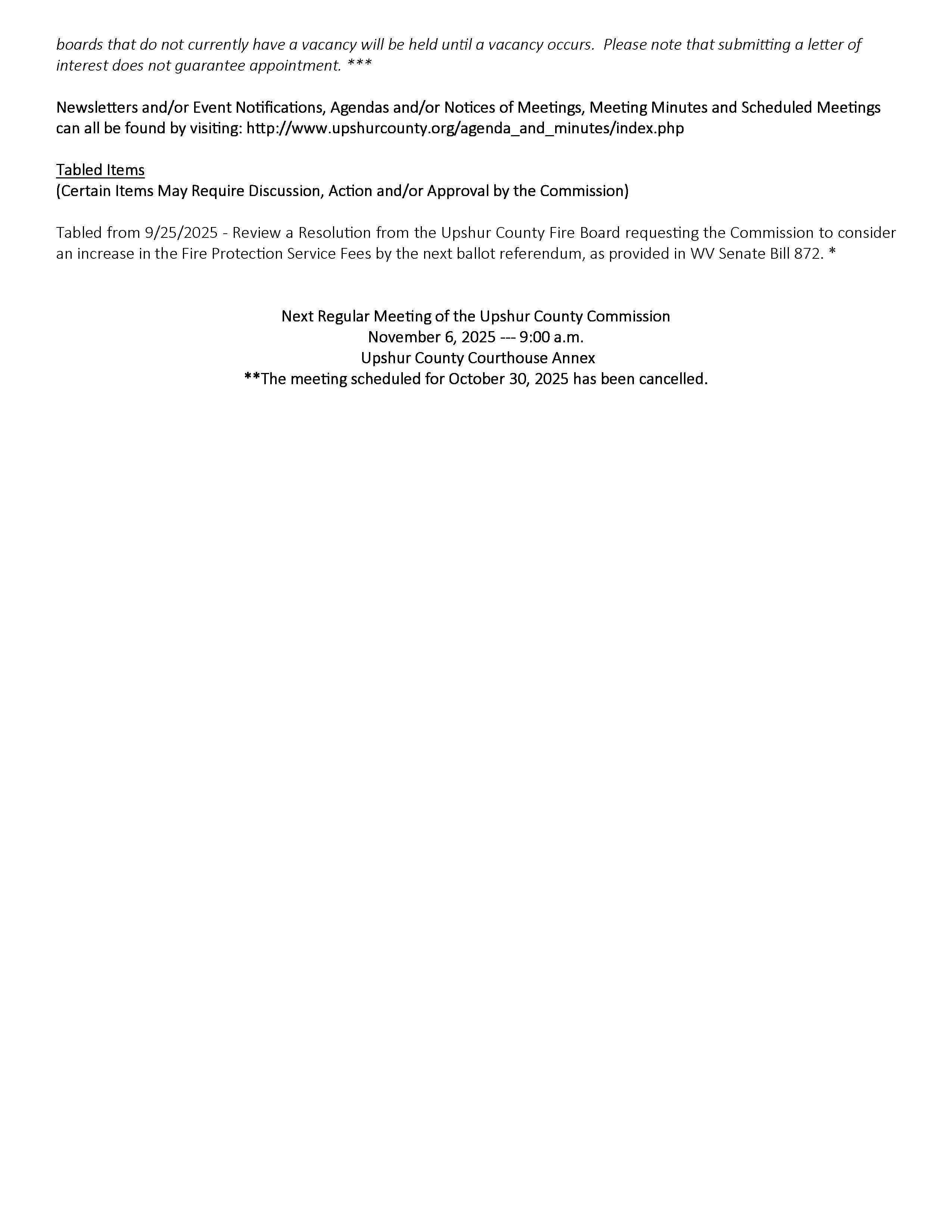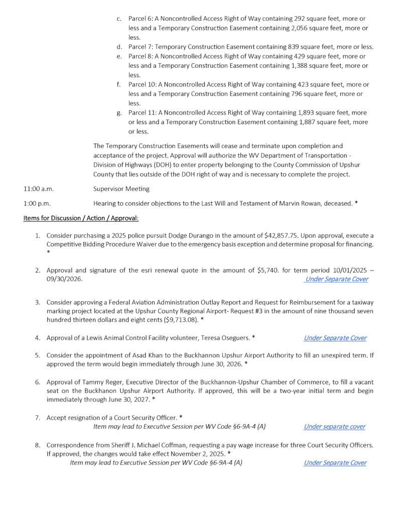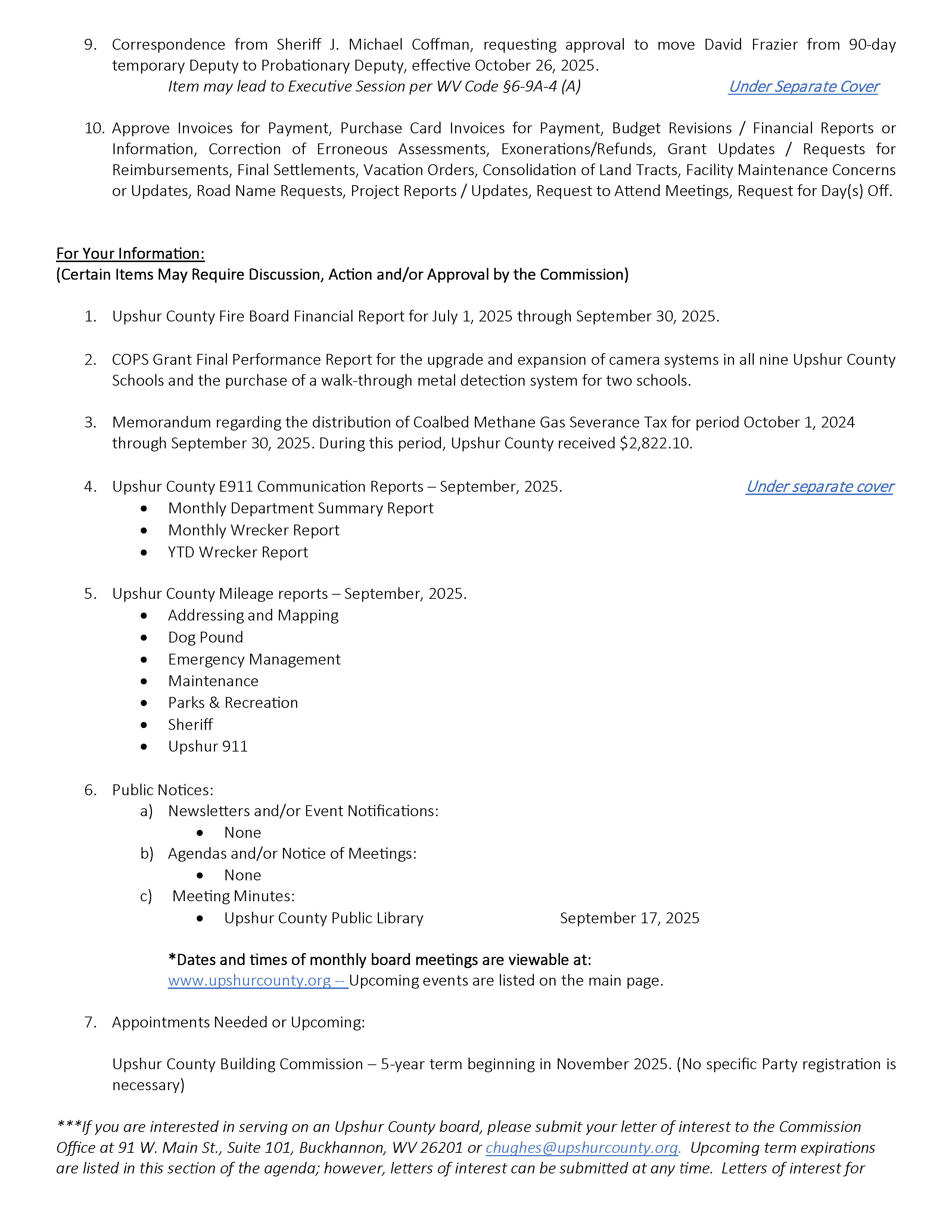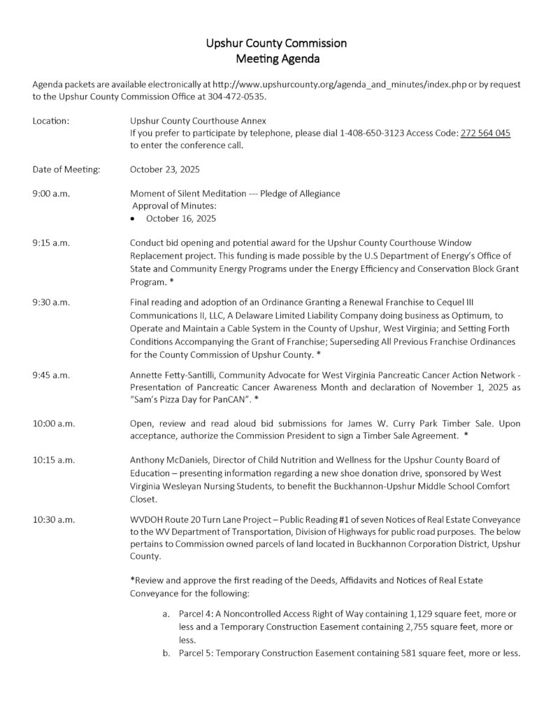 Here is the agenda for the Upshur County Commission meeting scheduled for October 23, 2025.