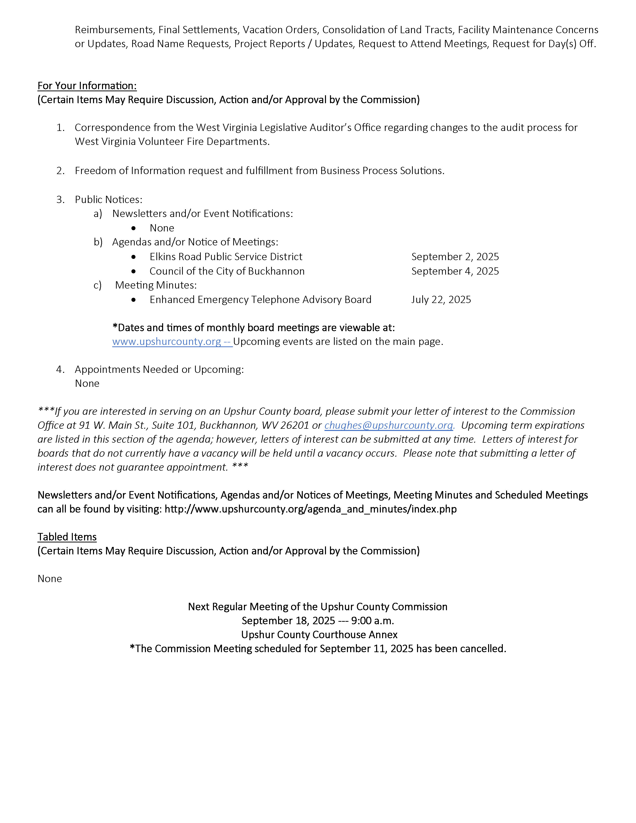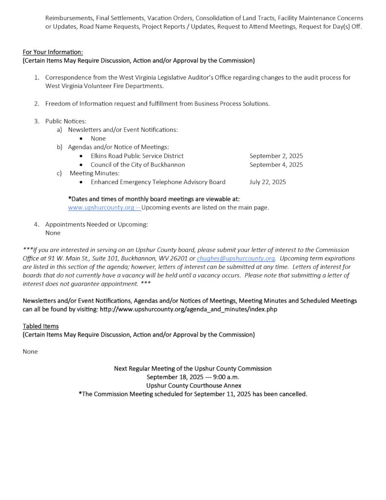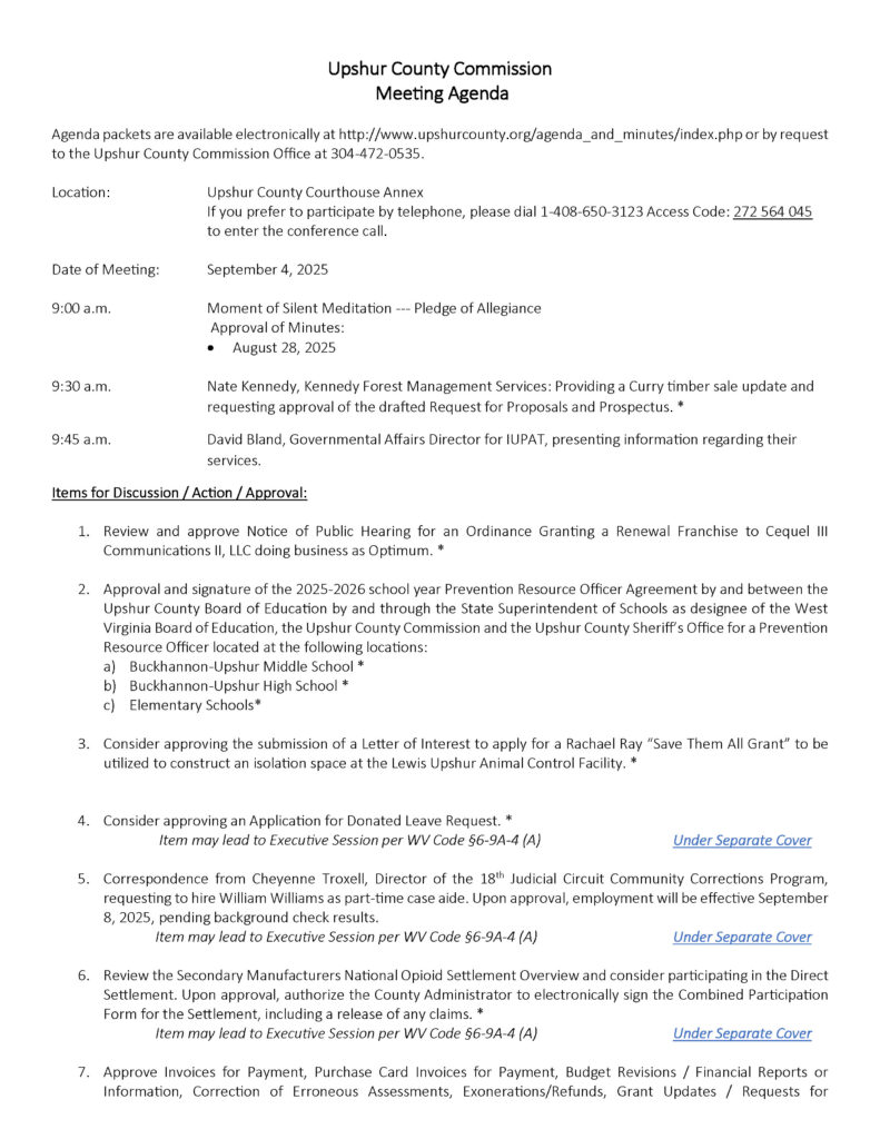 Here is the agenda for the Upshur County Commission meeting scheduled for September 4, 2025.