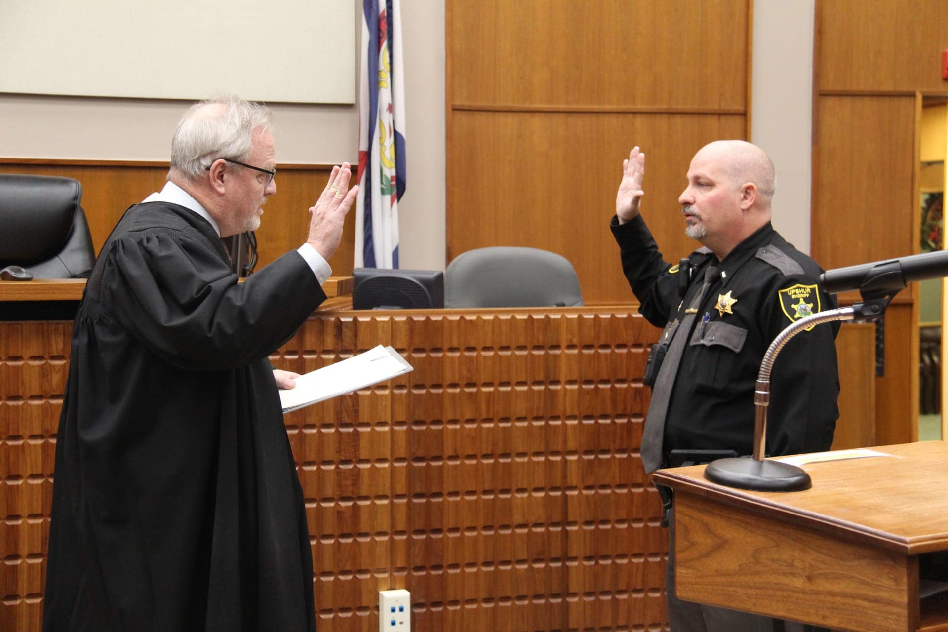 The Upshur County Commission joined the sheriff’s department in the circuit courtroom on Dec. 11 to swear in Theron Caynor as the new chief deputy for the Upshur County Sheriff’s Office. Sheriff Mike Coffman said Caynor has worked his way through the ranks and has been known to step in when Coffman was unavailable.