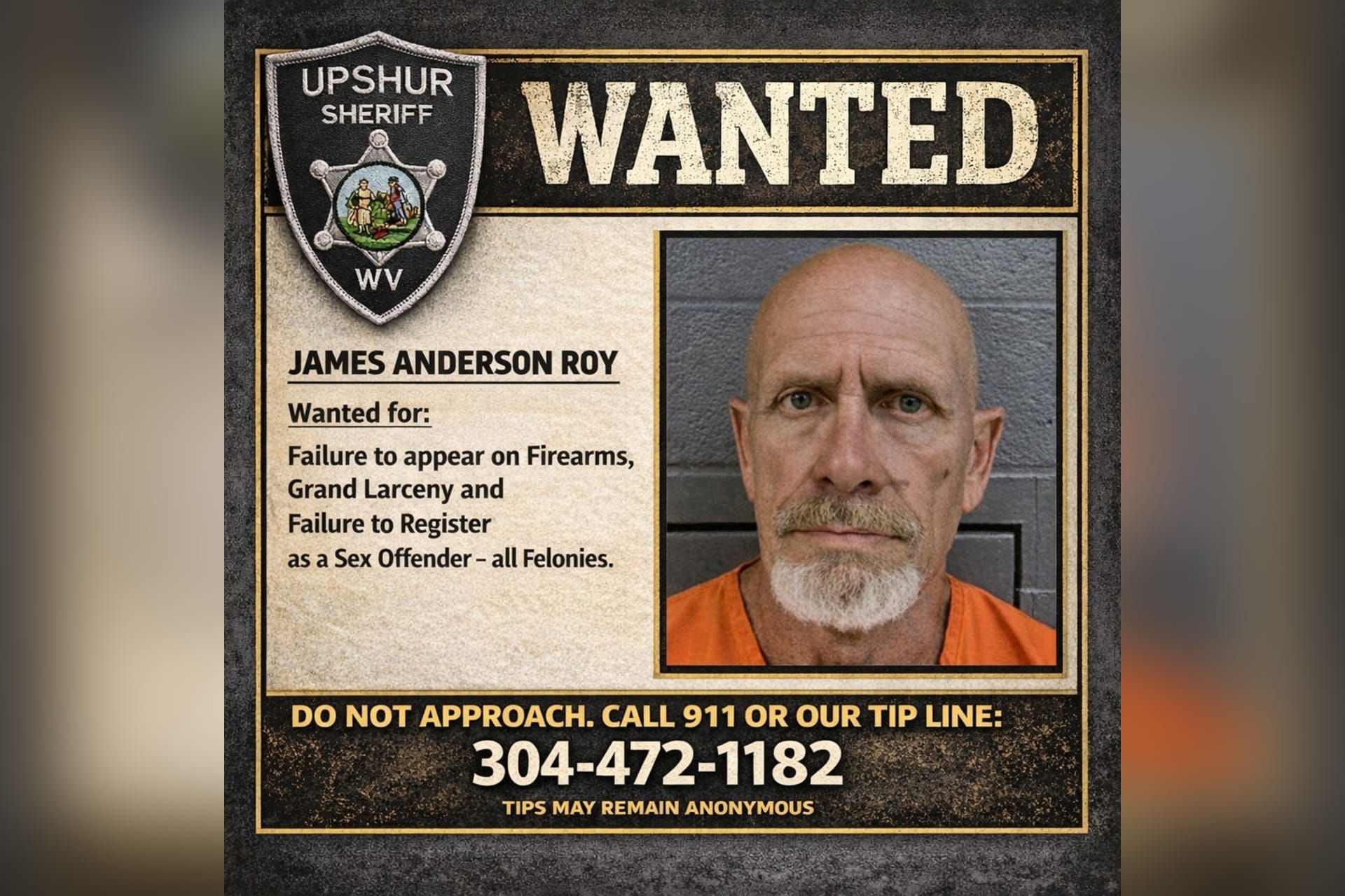 Anyone with information on Roy’s whereabouts is asked not to approach him. Instead, call 911 or the sheriff’s office tip line at 304-472-1182. Tips may remain anonymous.