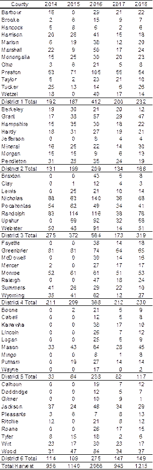 Leading the state was Randolph County, with hunters harvesting 76 birds, followed by Nicholas (68), Greenbrier (65), Upshur (58), and Preston County (54). The top three counties had a four-week season with Upshur and Preston County having a two-week season. District 3 hunters harvested 319 birds, followed by District 1 (232), District 4 (230), District 2 (168), District 6 (149), and District 5 (117).