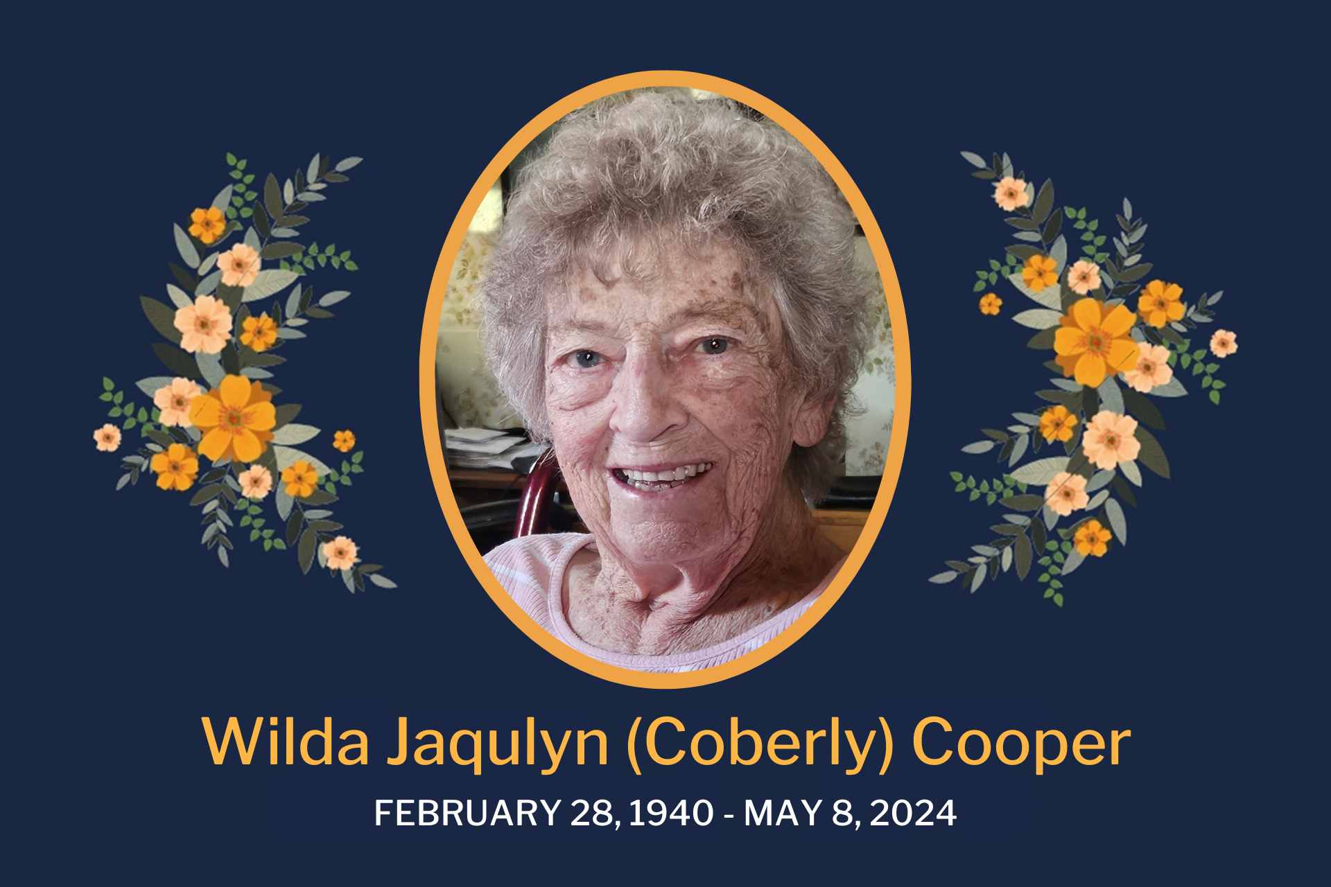 Our beloved mother, grandmother and great grandmother, Wilda Jaqulyn (Coberly) Cooper, entered fully into the presence of the Lord on Wednesday, May 8, 2024. She was 84.