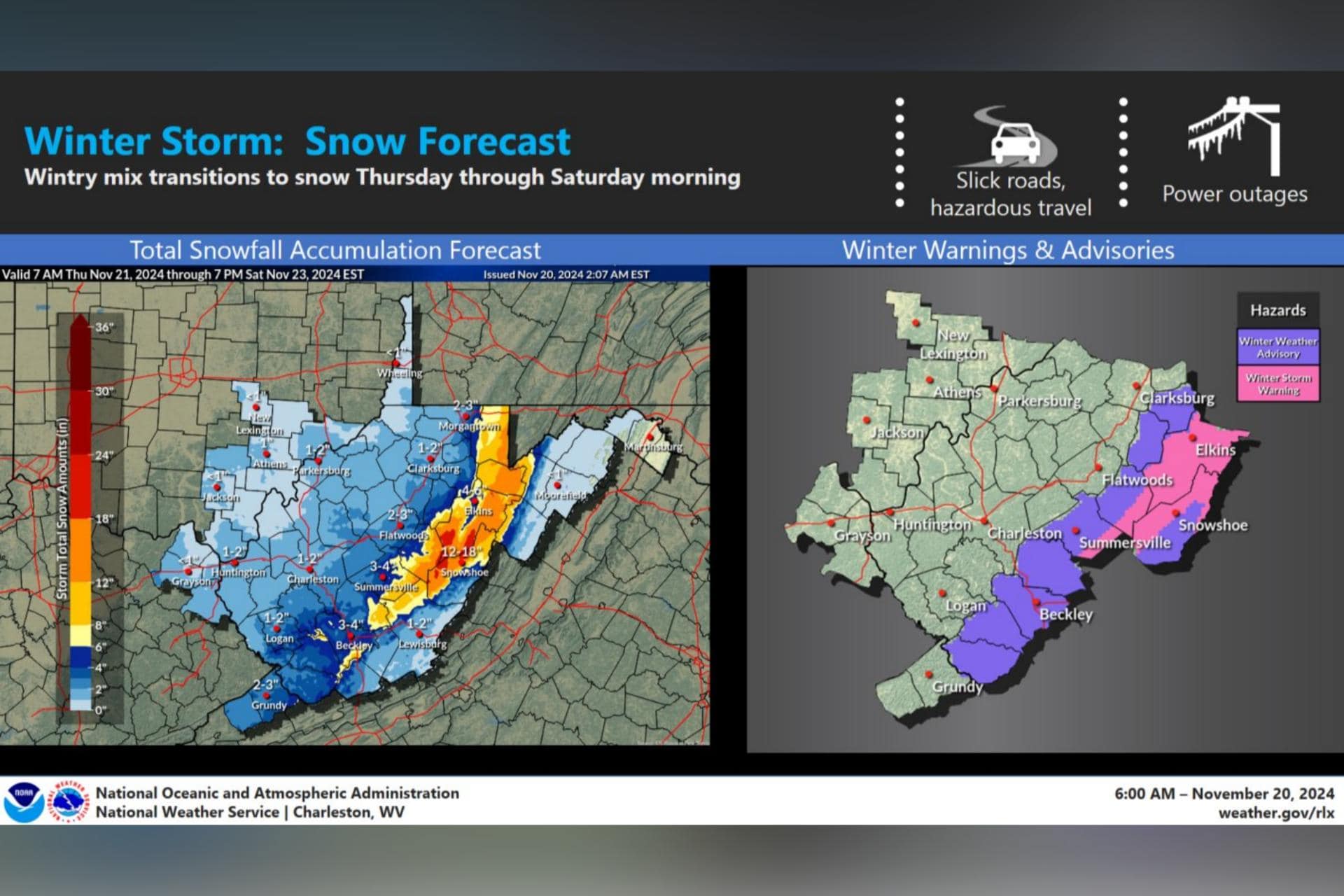 Areas in the eastern mountains, including Randolph and Pocahontas counties, are under a more severe winter storm warning, with heavy snow expected. Total snow accumulations between 10 and 20 inches are possible in the mountains, with winds gusting as high as 45 mph.