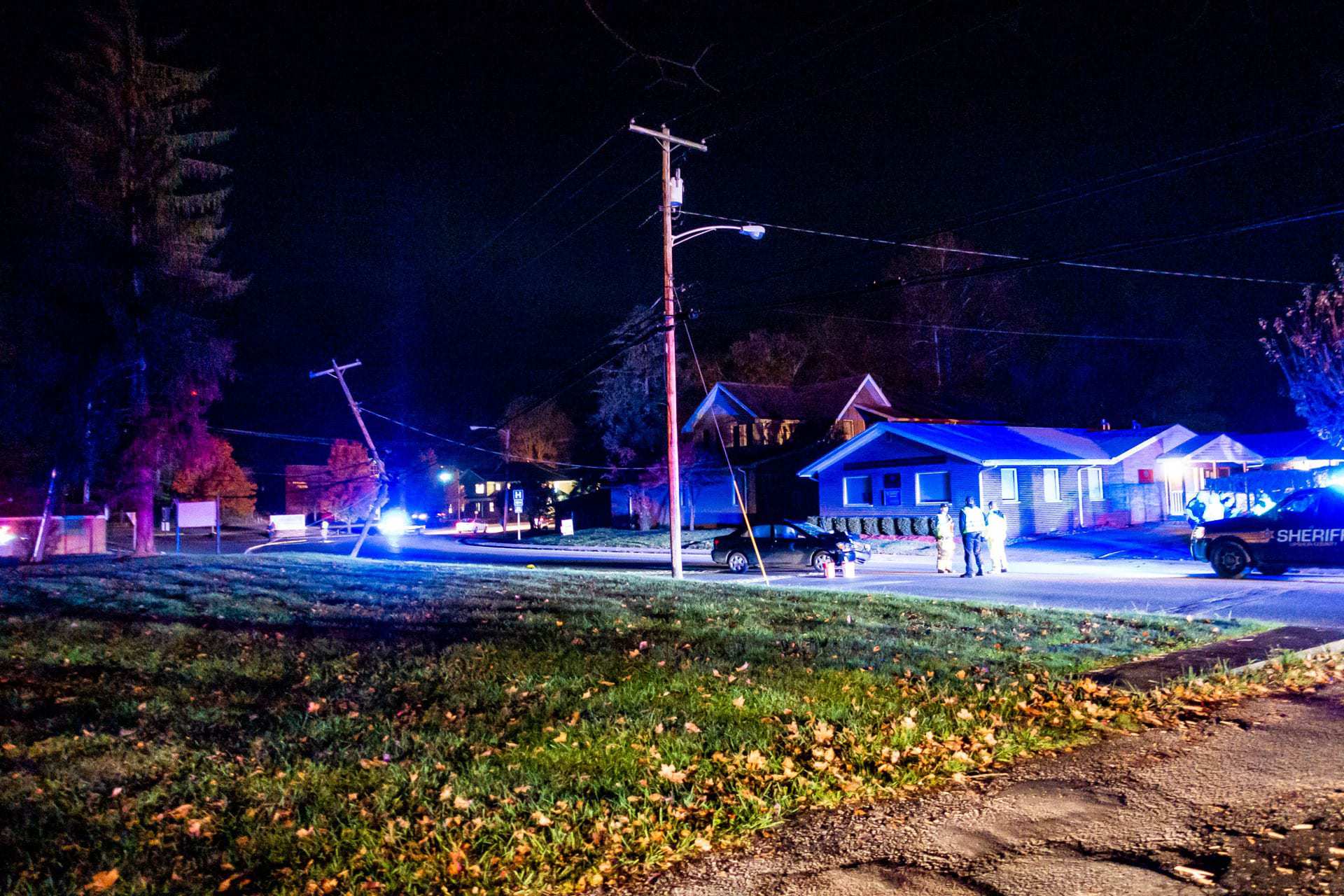 The wreck snapped the pole in half, causing much of town to the west of Route 20 to lose power. The stoplight at the courthouse also went dark.
