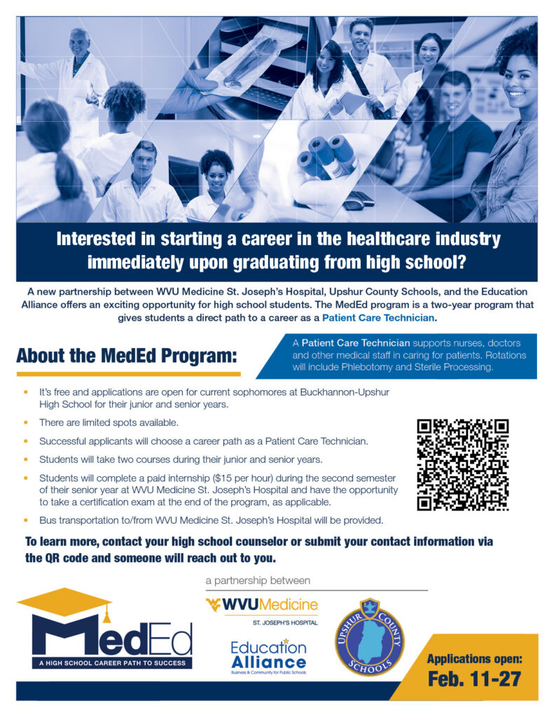 The MedEd Program reflects a shared commitment by WVU Medicine St. Joseph’s Hospital, Upshur County Schools and the Education Alliance to expand career-ready opportunities for students while addressing workforce needs in healthcare. For more information, contact your high school counselor or visit WVU Medicine St. Joseph’s Hospital’s social media.