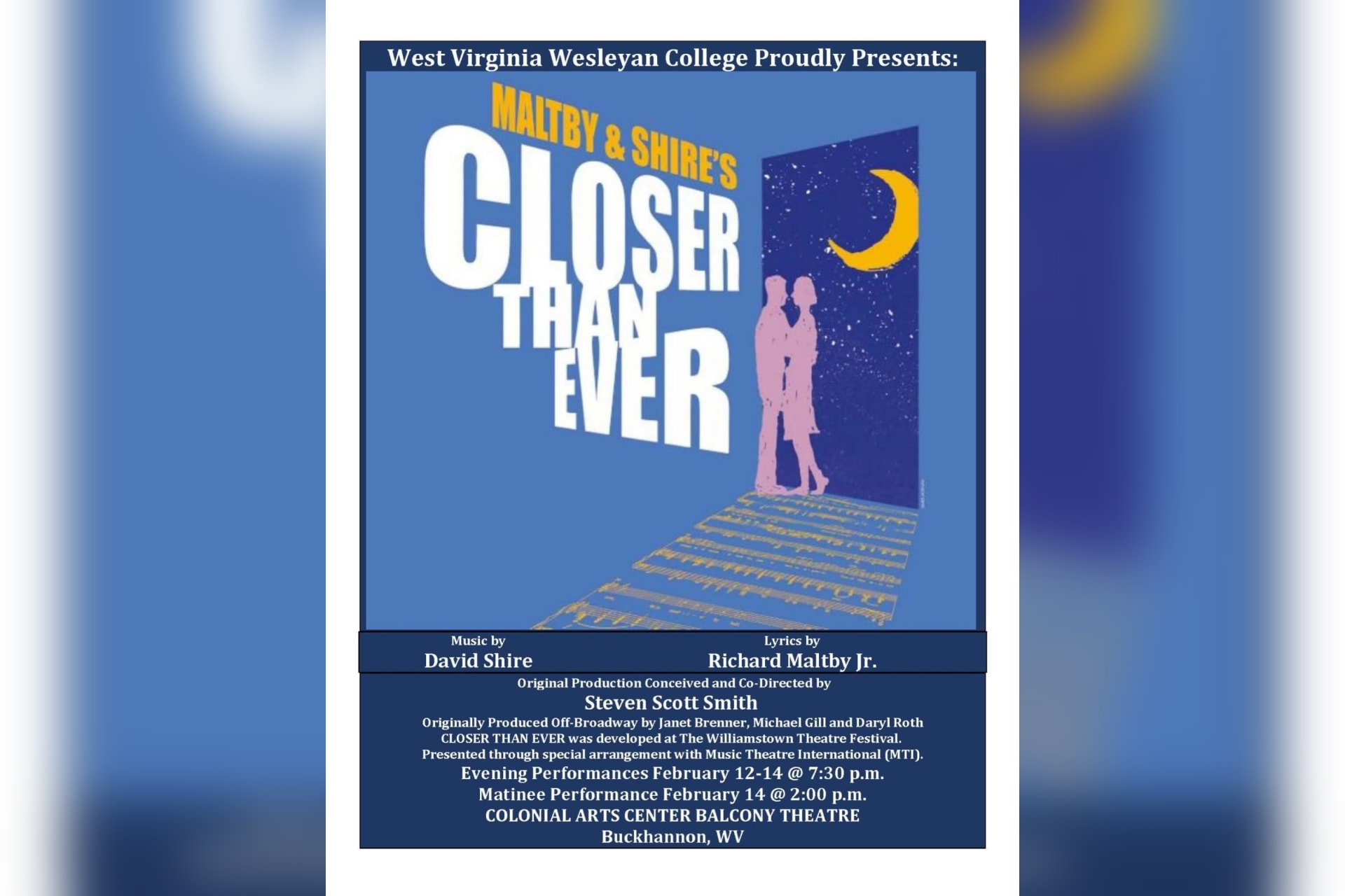 The West Virginia Wesleyan College Departments of Theatre & Dance and Department of Music present Maltby and Shire’s “Closer Than Ever” Thursday, Feb. 12 through Saturday, Feb. 14 at 7:30 p.m. and also Saturday, Feb. 14 at 2 p.m. in the Balcony Theatre at the Colonial Arts Center in downtown Buckhannon.